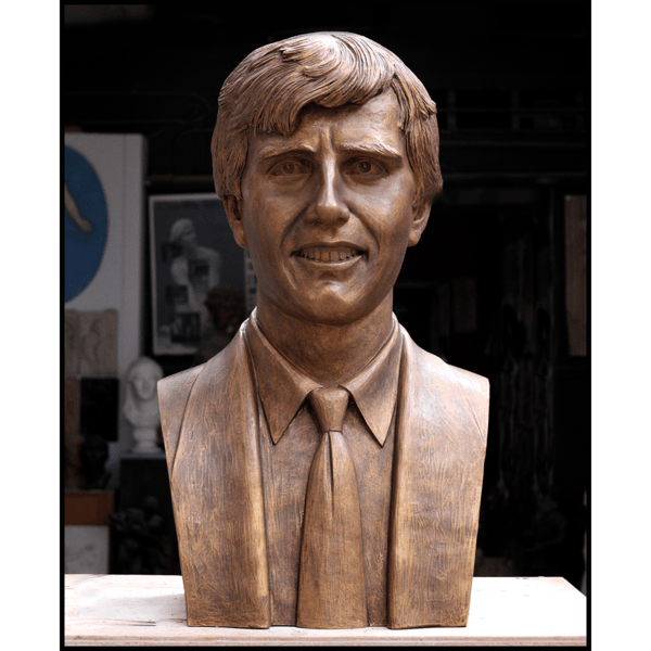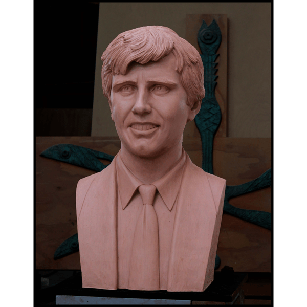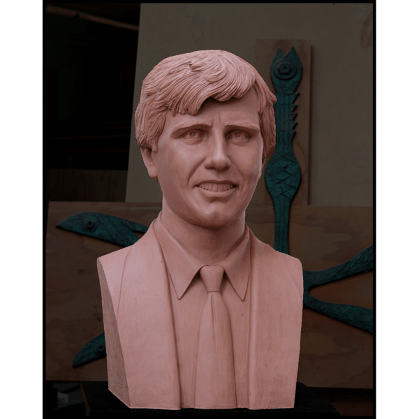Citizens Energy Corporation, the nonprofit company founded and managed by the Kennedy family, commissioned a sculpture of Michael Kennedy (1958-1997) in cooperation with the Catholic University of Angola for placement at the school. Kennedy was a lawyer, businessman, and activist who also managed Citizens Energy at one time. He played a large role in the creation of the school, and the bust was presented in May 2023 when the university dedicated a building in Kennedy’s name. Robert took care in sculpting the likeness and in capturing Kennedy’s spirit so that the bust would be a meaningful memorial.